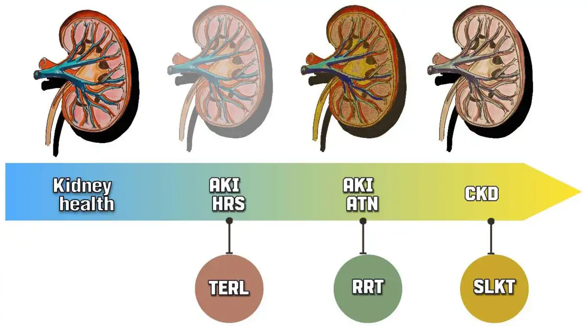 Differential diagnoses of acute kidney injury in cirrhotic patients and potential therapeutics. AKI in cirrhotic patients can be challenging, as it requires distinguishing between HRS and ATN. Both conditions can progress to CKD. Treatment options also differ, with TERL being indicated for HRS and RRT being a better option for AKI-ATN. In cases of CKD, a liver transplant alone may not be sufficient, and a SLKT may be a more suitable choice. AKI, acute kidney injury; HRS, hepatorenal syndrome; ATN, acute tubular necrosis; CKD, chronic kidney disease; TERL, terlipressin, RRT, renal replacement therapy; SLKT, simultaneous liver-kidney transplant.