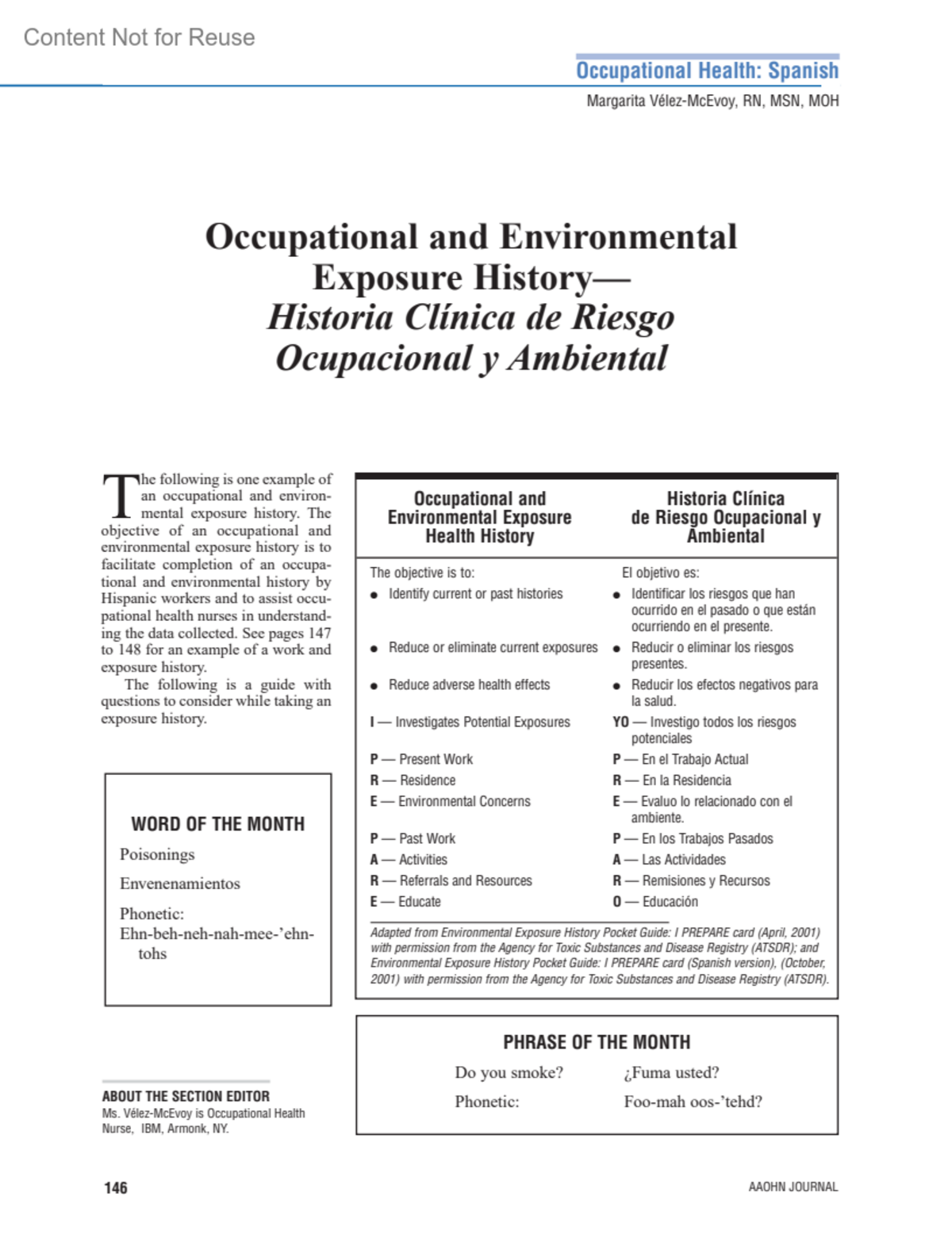 Occupational and Environmental Exposure History—Historia Clínica de Riesgo Ocupacional y AmbientalAuthor informationMs. Vélez-McEvoy is Occupational Health Nurse, IBM, Armonk, NY.AAOHN Journal 52(4):p 145-148, April 2004.Copyright © 2004 SLACK Incorporated