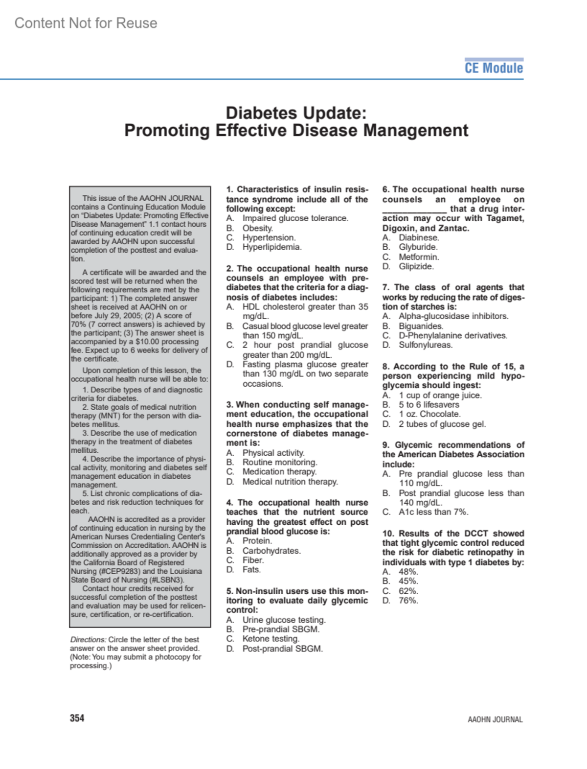 Diabetes UpdatePromoting Effective Disease ManagementAAOHN Journal 52(8):p 354-355, August 2004.Copyright © 2004 SLACK Incorporated