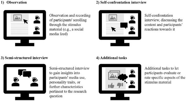 Another peculiarity concerns the artifact used for the self-confrontation. In comparison to “regular” self-confrontation interviews (and similar approaches), our adaption is focused on the investigation of users’ perceptions of digital media content, which is why participants are not confronted with a full recording of the performed task (e.g., of their browsing session), but only with the stimulus material used (e.g., a social media feed). The advantage of this adaption is that participants are not distracted by their own image in the video, but compelled to focus on the content. Without having to pause the recording several times, the researcher also does not disrupt participants’ think-aloud sessions. It further allows the researcher to direct the conversation more specifically to the experiences that are central to the research interest and to stimulus elements that the participant did not recognize. Moreover, this reduces waiting times resulting from having to convert and review the entire recording of the videoconferencing session.