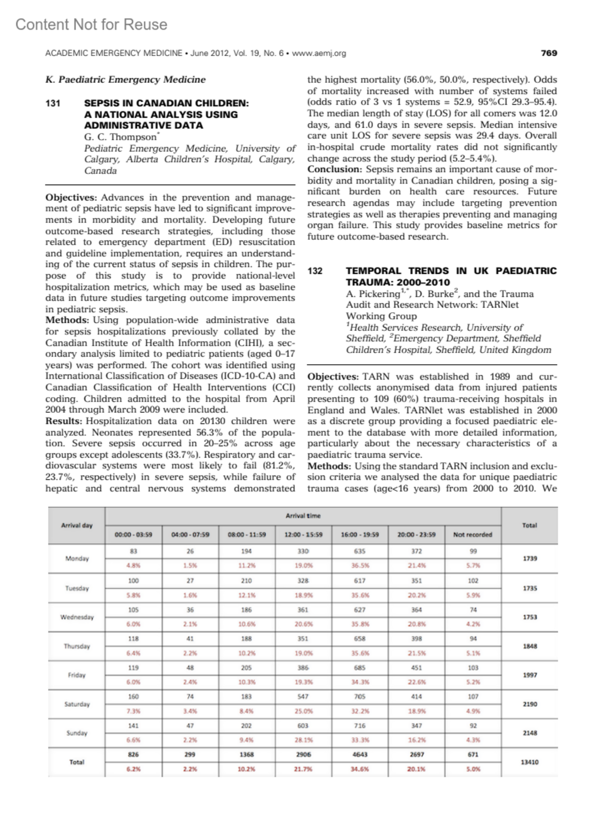 SEPSIS IN CANADIAN CHILDREN: A NATIONAL ANALYSIS USING ADMINISTRATIVE DATA131Thompson, G. C.Author informationPediatric Emergency Medicine, University of Calgary, Alberta Children's Hospital, Calgary, CanadaAcademic Emergency Medicine 19(6):p 769, June 2012.Copyright © 2012? The Society for Academic Emergency Medicine