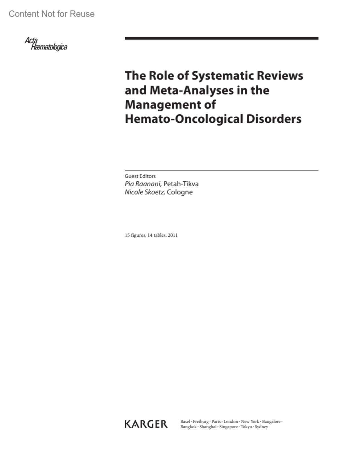 The Role of Systematic Reviews and Meta-Analyses in the Management of Hemato-Oncological DisordersKarger, S.Author information1Petah-Tikva2CologneMedical and Scientific Publishers Basel Freiburg Paris London New York Bangalore Bangkok Shanghai Singapore Tokyo SydneyPublished online: December 8, 2010Fax +41 61 306 12 34E-Mail [email protected]www.karger.comActa Haematologica 125(2):p 1-2, January 2011. | DOI: 10.1159/000321858Copyright © 2011 S. Karger AG, Basel
