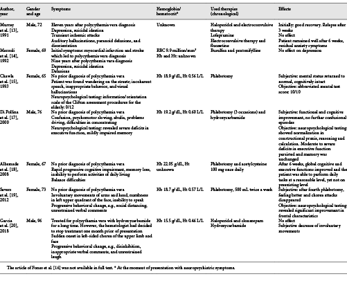 Whereas, chorea is a rare but recognized symptom of polycythemia vera, neuropsychiatric symptoms have only been reported in 8 former published reports (shown in Table 2) [-]. The first reports describing psychiatric symptoms date from the early nineties, in which 3 patients were admitted with acute mania or depression [-]. Two of them had been diagnosed with polycythemia vera several years before presentation and in 1 patient it was discovered during admission. Remarkably, all patients had transient ischemic attacks in their medical history. Despite poststroke depression being a rather well-known phenomenon, 2 of these patients had their first episode many years after the reported minor strokes; therefore, secondary mood disorder was considered less likely by their treating physicians [, ]. Moreover, in 2 cases, the mood disorder completely normalized after phlebotomy and normalization of the hemoglobin levels, which supports the possible causality between polycythemia vera and the occurrence of these mood disorders [, ]. Between 2000 and 2019, only 5 more cases with neuropsychiatric symptoms have been published. All these patients presented with cognitive impairment including confusion, psychomotor slowing, general behavioral changes, and frontal lobe syndrome. One of the patients, like the first case we presented, even met the criteria for clinical dementia [-]. It is promising that each of these reports has shown at least partial, subjective reversibility of the cognitive deficits. In addition, in our case as well as the patient with frontal lobe syndrome described by Severs et al. [] in 2012, neuropsychological testing showed significant improvement after polycythemia vera treatment.