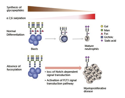The most widely occurring cancer-associated changes in protein glycosylation are increased sialylation, an increased number of branched-glycan structures, and the overexpression of core fucosylation []. A dramatic increase in cell surface alpha2,6 sialylation was previously reported during the late stage of myeloid maturation []. This is restricted to specific glycoproteins including CD11b and CD18. Changes in mature bone marrow myeloid cells are associated with reduced cell binding to fibronectin and cultured bone marrow stroma, which may play a role in the myeloid cell release from the bone marrow.