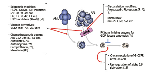 Vitamin A and its analogs, in general, and ATRA, in particular, play a critical role in the differentiation of neutrophils []. ATRA exert their antileukemic effects by degrading tumor-specific protein PML-RAR alfa []. Similar to decitabine, as noted before, ATO and ATRA also induce proteasome-dependent degradation of NPM1 mutant leukemic protein, leading to cell growth inhibition and apoptosis in NPM1-mutated AML []. Additionally, Vitamin D derivatives such as 1,25-dihydroxyvitamin D3 (1,25D), the hormonal and active form of vitamin D, and its synthetic analogs regulate multiple cell events including cell proliferation, survival, differentiation, and immune responses [-]. Although the underlying mechanism of action remains unknown, vitamin K2 has also been reported to induce apoptosis and differentiation []. 1,25D induces monocyte/macrophage-like differentiation, and cell cycle arrest through activating various kinase pathways including mitogen-activated kinases, c-Jun NH2-terminal kinases, and p38 mitogen-activated kinases []. 1,25D also modulates the expression of several miRNAs []. A major limiting factor in the clinical application of 1,25D is the supraphysiologic dose required, which results in systemic hypercalcemia []. Vitamin D derivatives have been suggested to have anti-neoplastic properties, but the translation of epidemiological and laboratory findings to the clinic has so far not been successful [, , ]. However, it may possible to overcome this using combination therapies of 1,25D with HDAC inhibitors or HMAs [], thus, highlighting the importance of epigenetic modifiers in differentiation therapy.