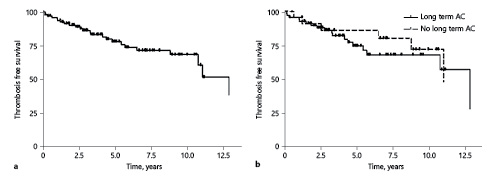 Kaplan-Meier curves for (a) thrombosis-free survival in the whole cohort and (b) thrombosis-free survival in patients with or without long-term AC after the index thrombosis. AC, anticoagulation.