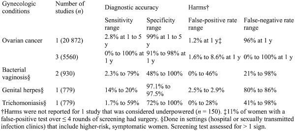 The main results of the review are in the Table; no studies assessing the effectiveness of screening pelvic examinations were found.