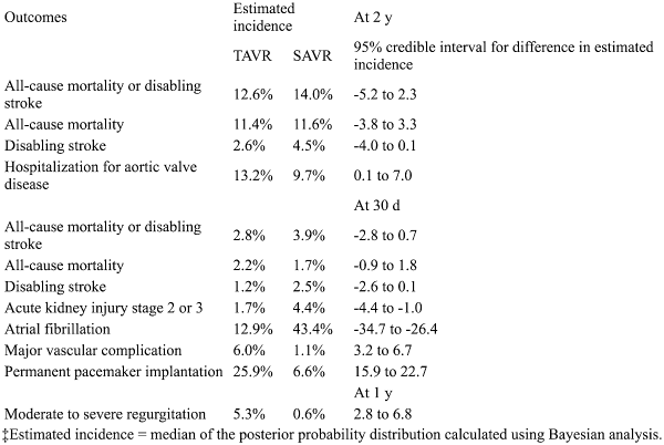 In patients with severe aortic stenosis and intermediate surgical risk, transcatheter aortic valve replacement (TAVR) was noninferior to surgical replacement for mortality and disabling stroke. Surgery increased short-term acute kidney injury and atrial fibrillation. TAVR increased short-term pacemaker implantation and major vascular complications and long-term hospitalization for aortic disease and regurgitation.