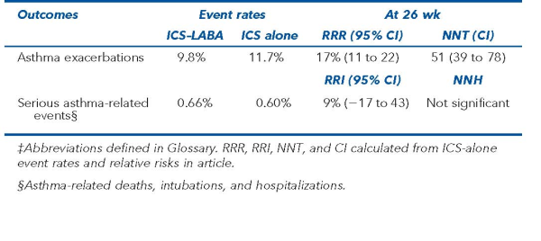 For the primary outcome, there were 2 asthma-related deaths (ICS–LABA group) and 3 asthma-related intubations (1 in the ICS–LABA group); this outcome was considered not to have provided robust results. Results for serious asthma-related events and asthma exacerbations are in the Table.