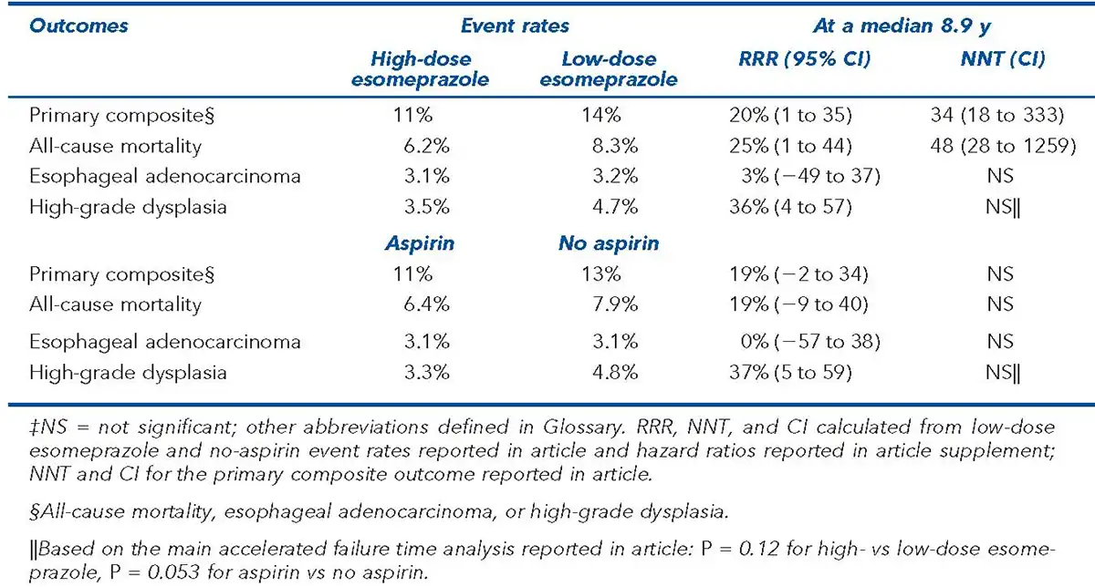 In Barrett esophagus (BE), does high- vs low-dose esomeprazole and aspirin vs no aspirin reduce all-cause mortality, esophageal adenocarcinoma, and high-grade dysplasia?