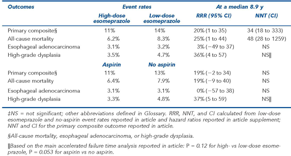In Barrett esophagus, high- vs low-dose esomeprazole reduced a composite of all-cause mortality, esophageal adenocarcinoma, or high-grade dysplasia; aspirin vs no aspirin did not.