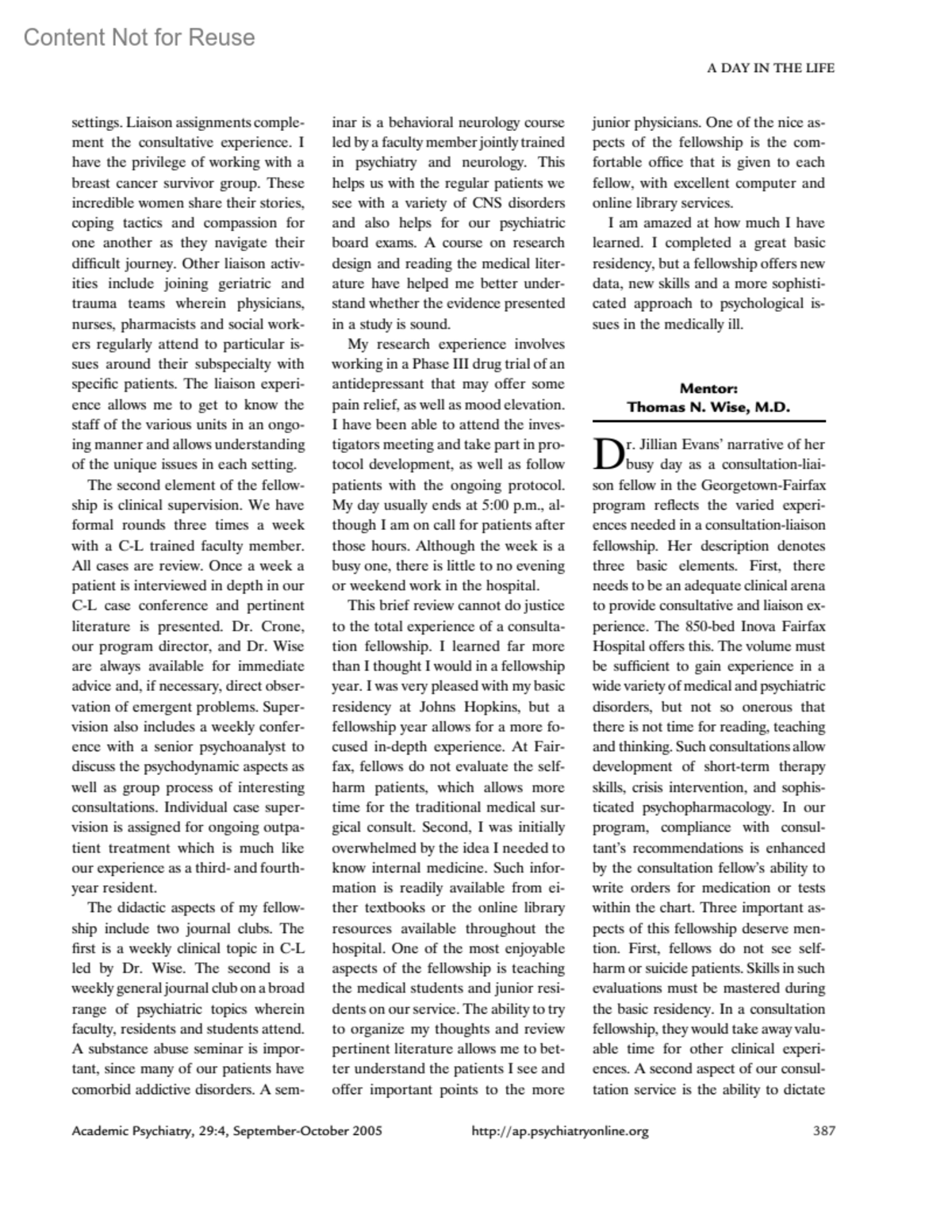 Mentor, Dr. Evans is Associate Director, Inpatient Psychiatry, Georgetown University School of Medicine, Washinton, DC. Dr. Wise is Chairman, Department of Psychiatry, Inova Fairfax Hospital, Falls Church, VA.
