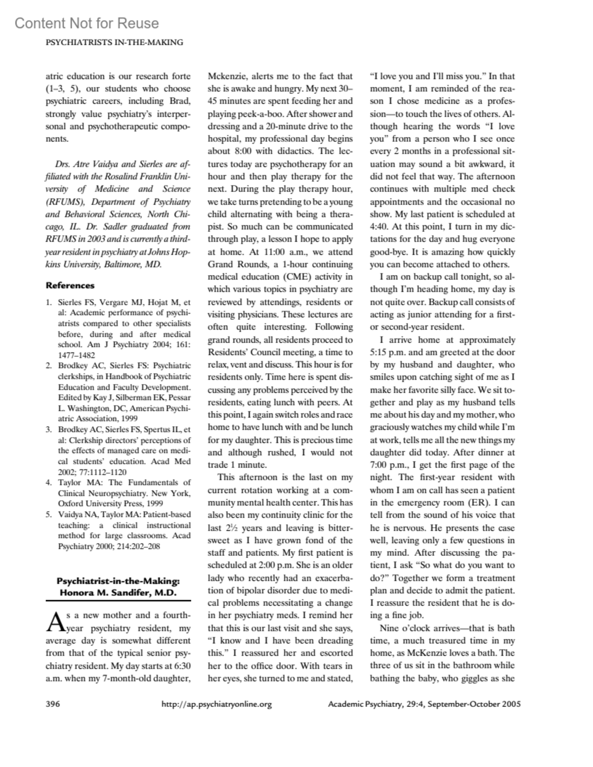 A Day in the Life of a Psychiatrist in-the-MakingSandifer, Honora M. M.D.Author informationPsychiatrist-in-the-MakingAcademic Psychiatry 29(4):p 396-397, September-October 2005.Copyright © 2005 Academic Psychiatry