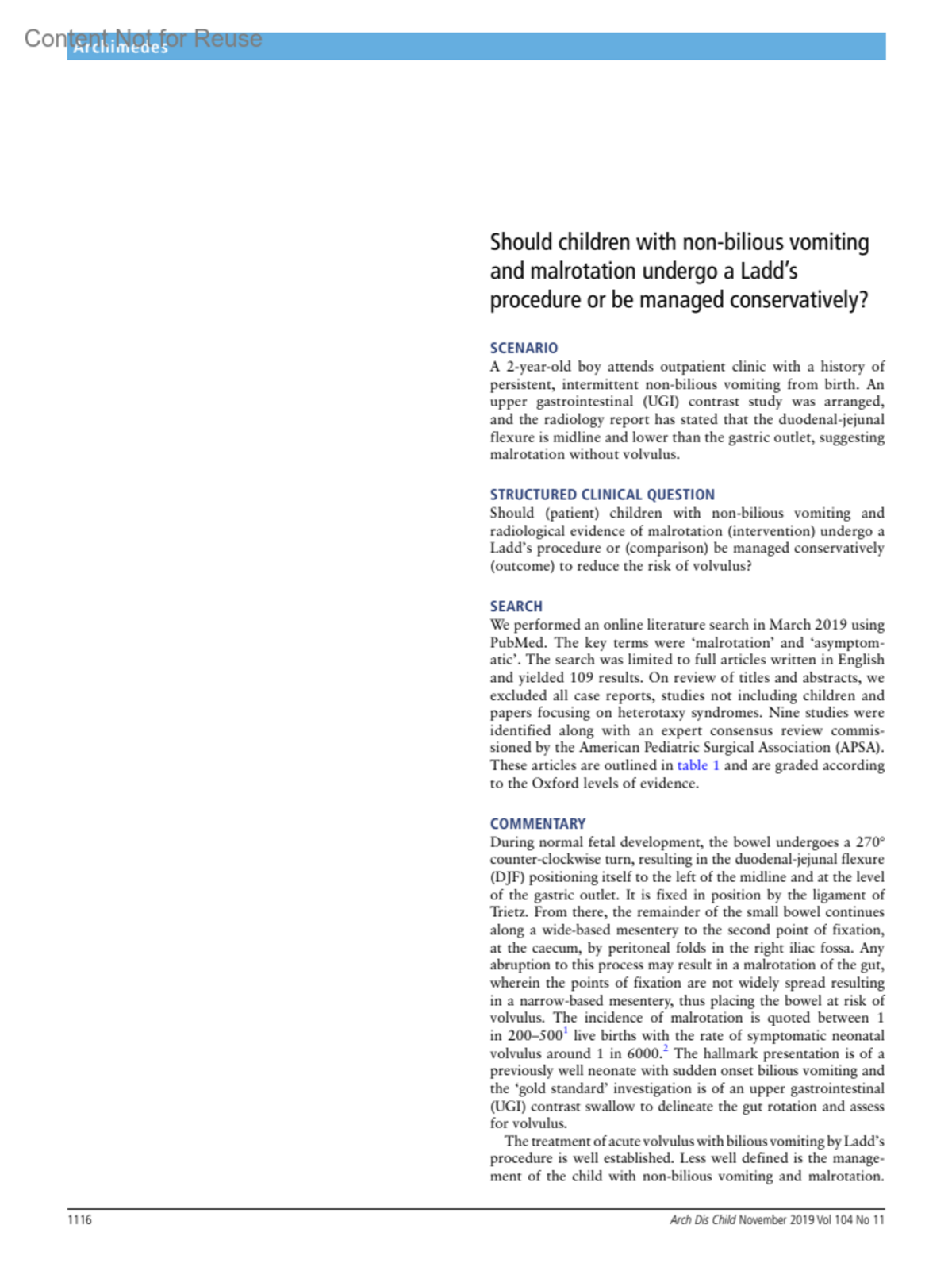 Should children with non-bilious vomiting and malrotation undergo a Ladd’s procedure or be managed conservatively?