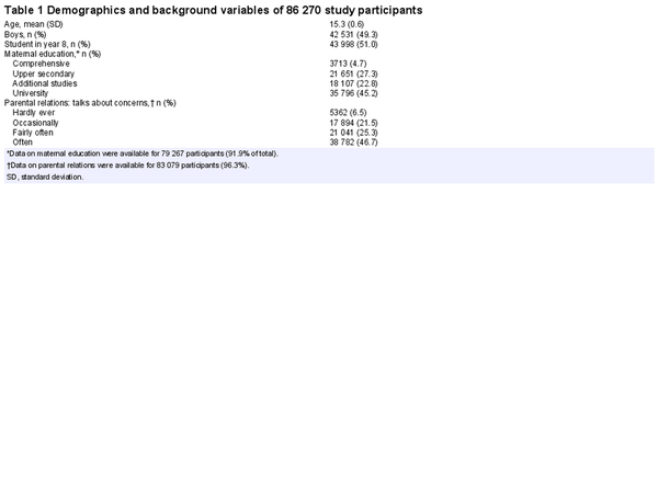 The 86 270 participants (response rate: 73.0% of respective age group) showed even gender and age distribution (table 1). Mothers most commonly had university or other higher-level education, and parental relations were most often good.
