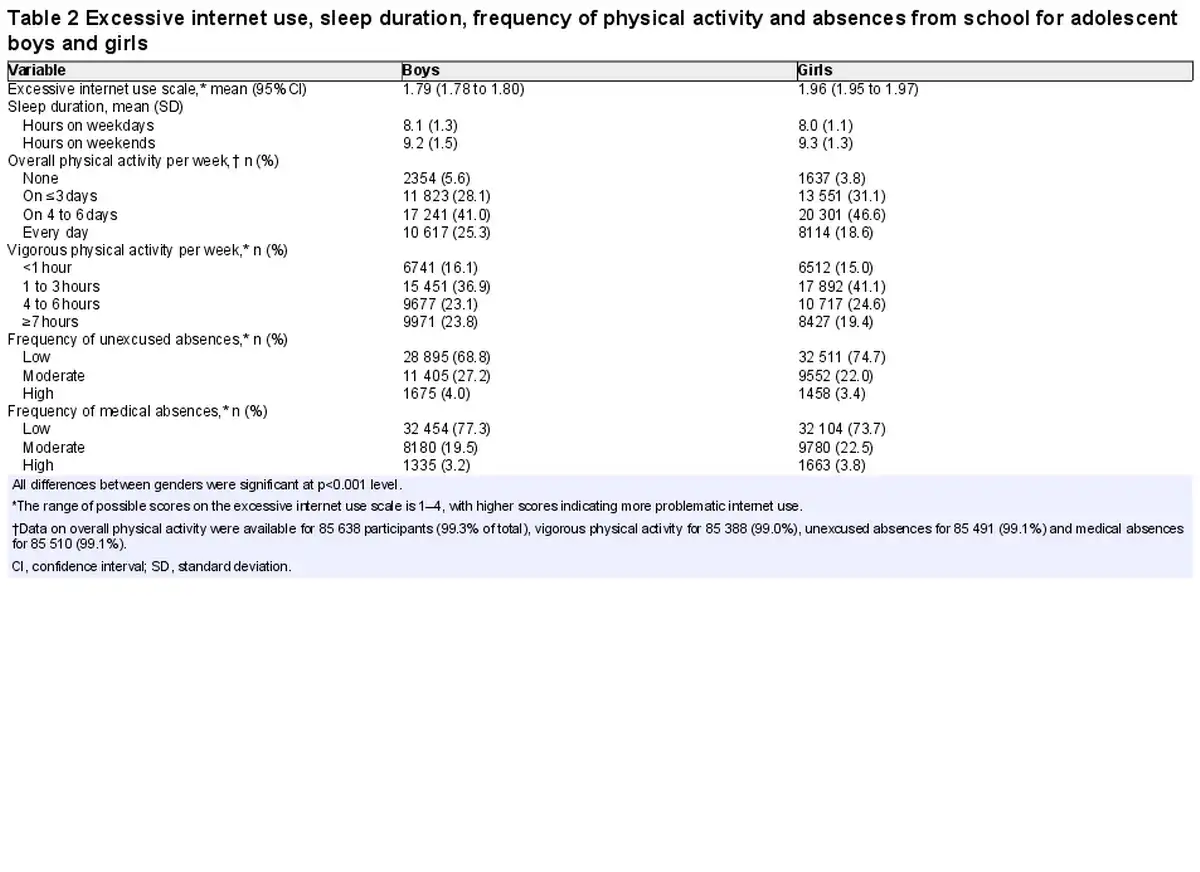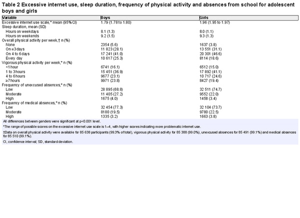 In this nationally representative population-based study, adolescent girls reported more excessive internet use (EIU) than did boys, more than one-third of adolescents slept less than 8 hours per night during the school week and more than half of adolescents engaged in vigorous exercise for less than 3 hours weekly. EIU, short sleep duration during weekdays and low PA were all associated with both unexcused and medical absences from school among 14–16 year old students. Talking about concerns with parents often emerged as the strongest protective factor for both unexcused and medical absences.