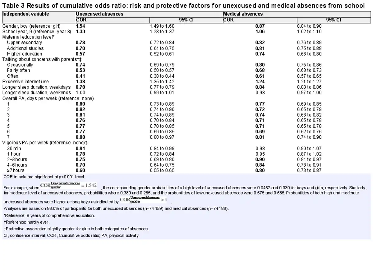 The objective of this study was to examine the associations of EIU, short sleep and PA with unexcused absences and medical absences from school among adolescents. We hypothesised that EIU would be associated with a higher risk of both unexcused and medical absences, whereas sleep and PA would have a protective association.