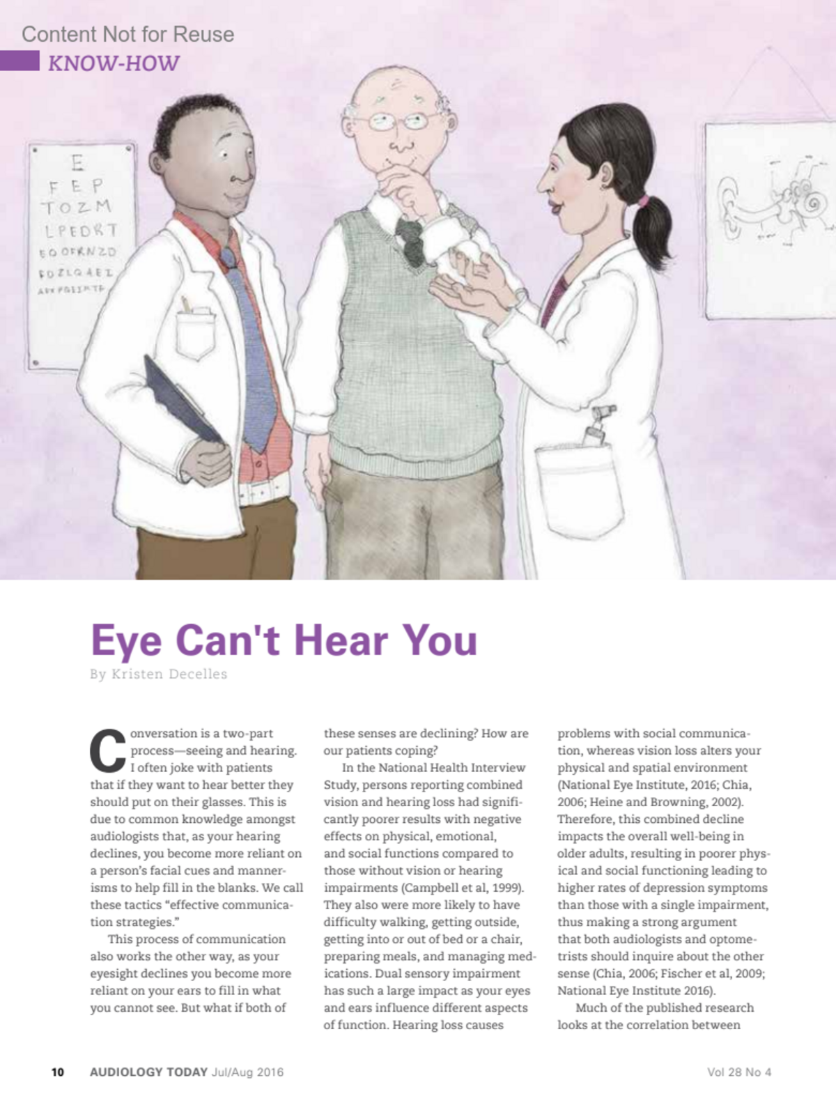 Eye Can't Hear YouDecelles, KristenAuthor informationKristen Decelles, AuD, Board Certified in Audiology, is in the hearing services department at St. Luke's Cataract and Laser Institute in Tarpon Springs, FL, and is also a member of the Academy's BEST Committee.Illustration by Johanna van der Sterre.Audiology Today 28(4):p 10-12, July-August 2016.Copyright ©2016 The American Academy of Audiology