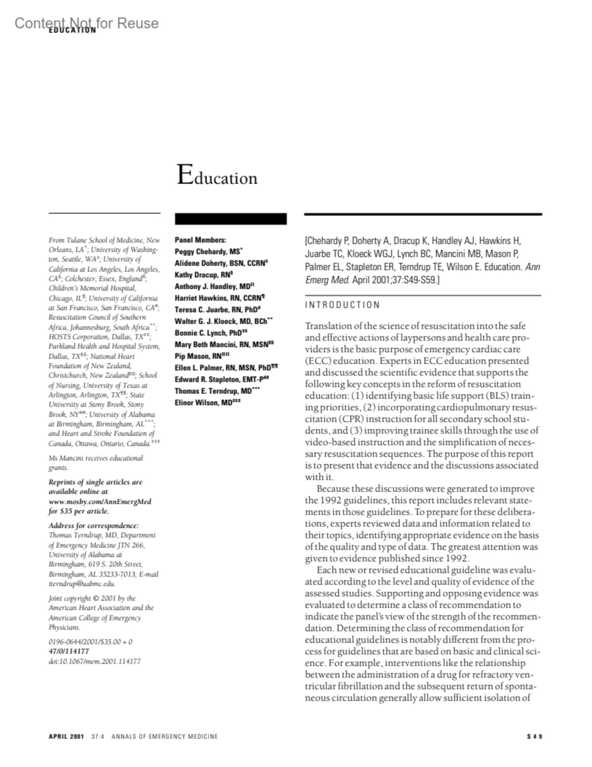 [Chehardy P, Doherty A, Dracup K, Handley AJ, Hawkins H, Juarbe TC, Kloeck WGJ, Lynch BC, Mancini MB, Mason P, Palmer EL, Stapleton ER, Terndrup TE, Wilson E. Education. Ann Emerg Med. April 2001;37:S49-S59.]