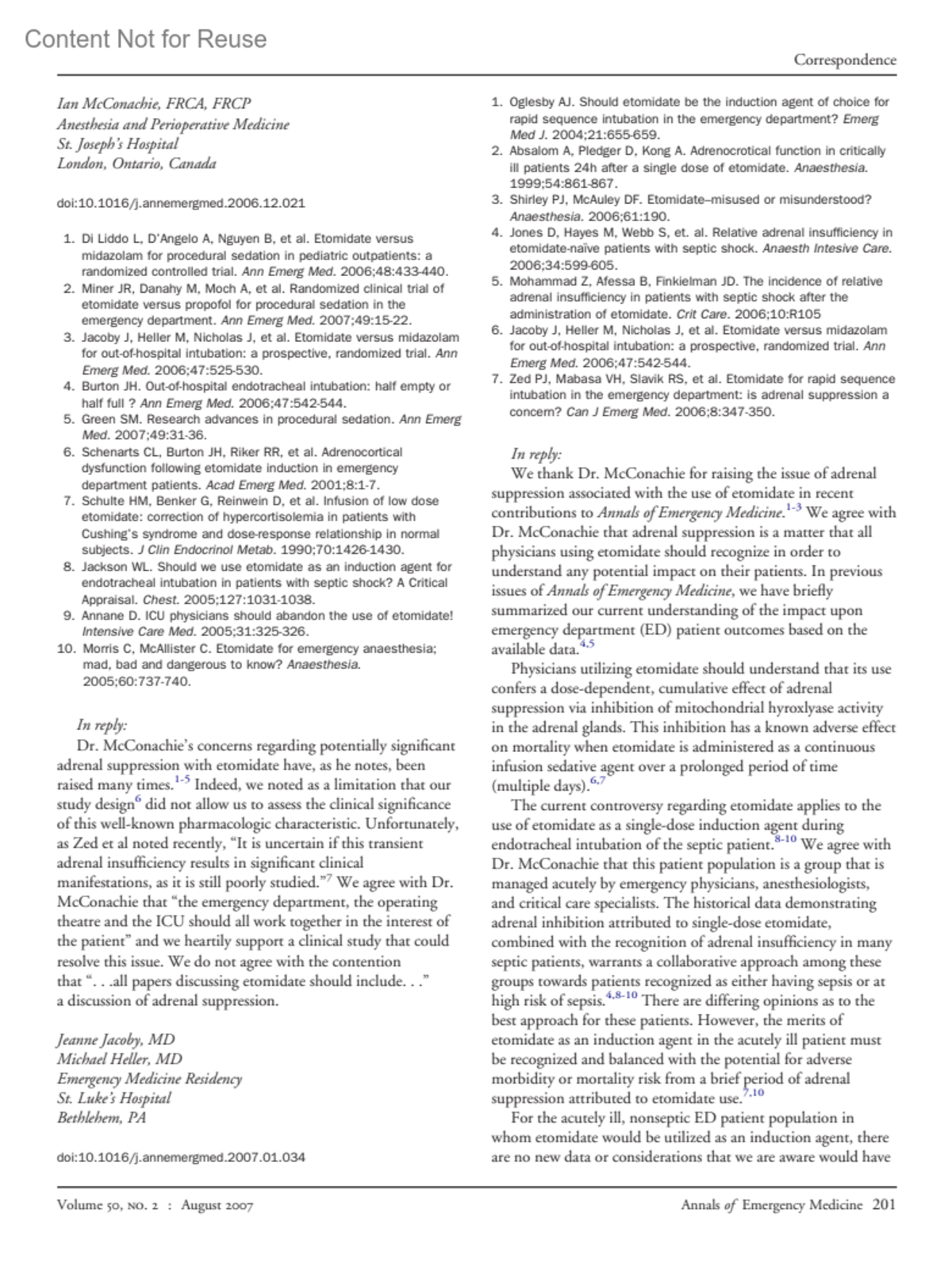 Etomidate Controversies in Emergency MedicineBurton, John H. MDGreen, Steven M. MDAuthor informationDepartment of Emergency Medicine, Albany Medical Center, Albany, NY (Burton)Professor of Emergency Medicine, Loma Linda University, CA (Green)Annals of Emergency Medicine 50(2):p 201-202, August 2007.Copyright © Mosby-Year Book Inc. 2007. All Rights Reserved.