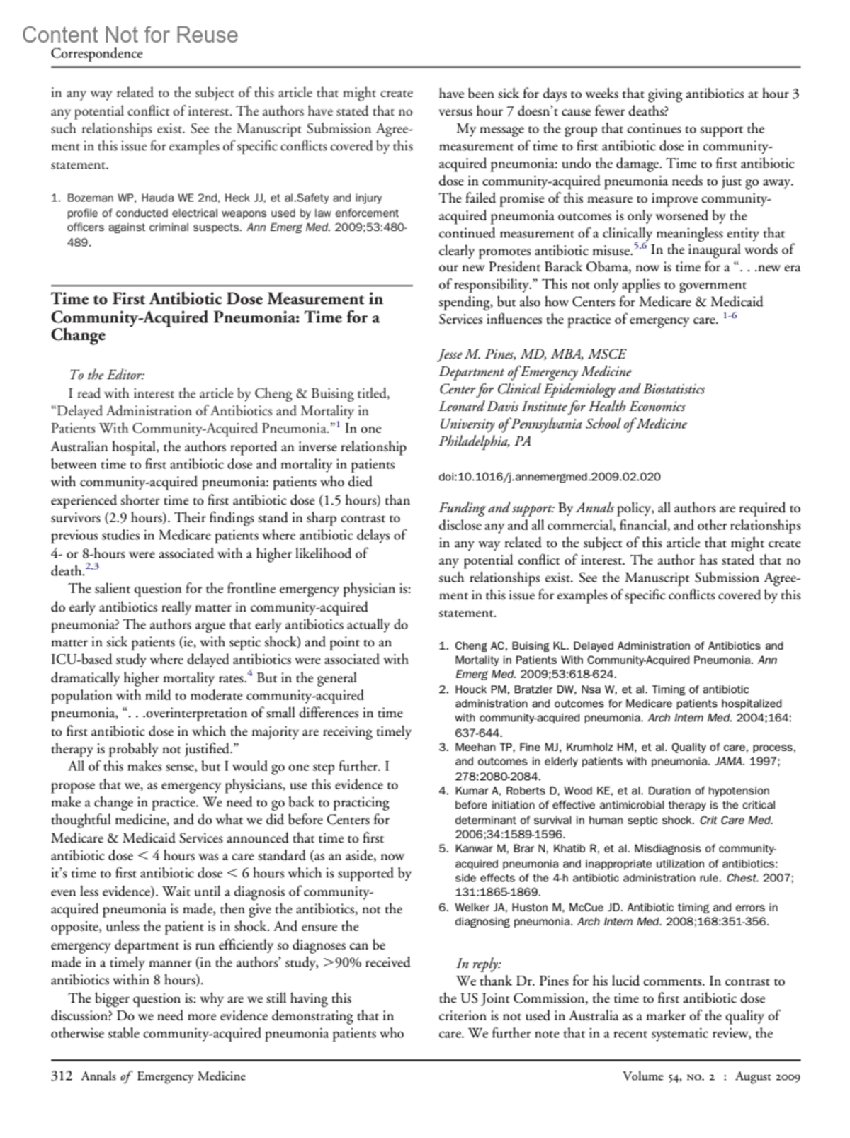 Annals of Emergency Medicine 54(2):p 312-313, August 2009.
