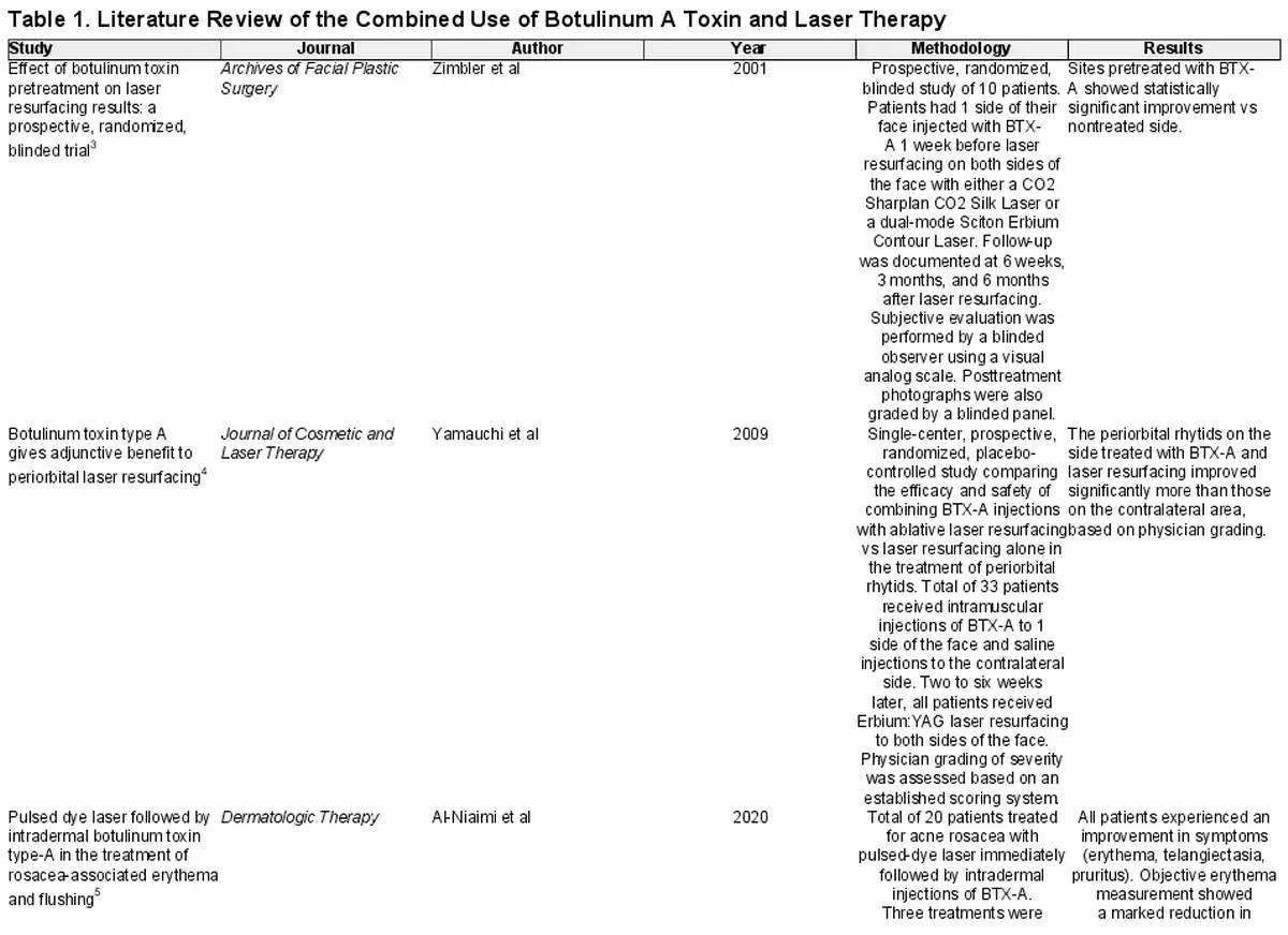 In both the randomized studies conducted by Yamauchi et al and Zimbler et al, ablative laser therapy was performed after treatment with BTX-A injections. In the study by Yamauchi et al, laser therapy was performed 2 to 6 weeks following injections with BTX-A, and in Zimbler et al's study laser therapy was performed 1 week after BTX-A., There has often been uncertainty surrounding the order and temporality of BTX-A and laser therapy given in combination. One view is that laser therapy should be carried out before treatment with BTX-A because of concerns regarding deactivation of the botulinum toxin or diffusion of the BTX-A molecules by the laser, but there is little literature to support one way or the other.