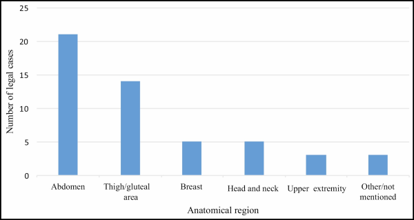 Number of legal cases associated with liposuction stratified on anatomical region.