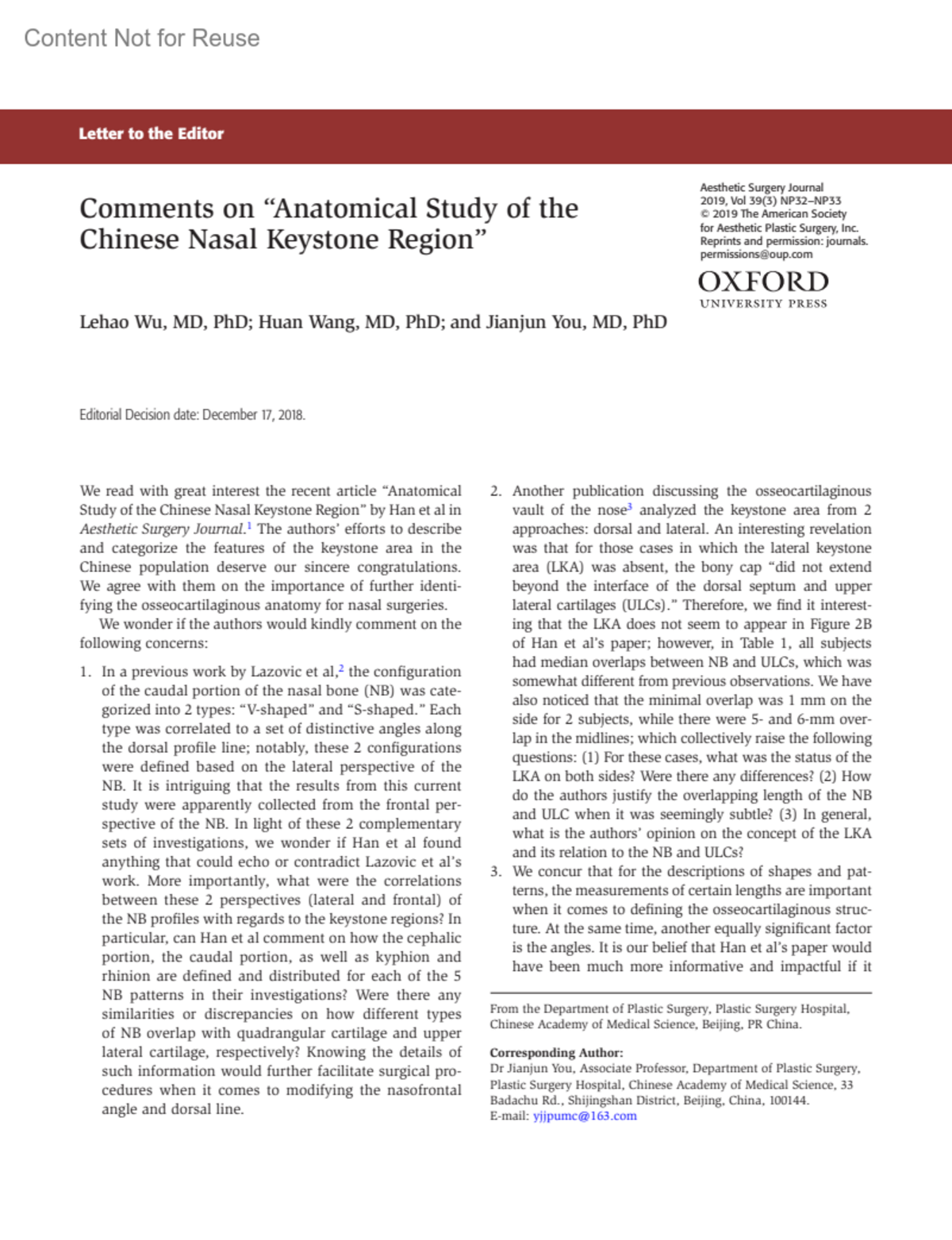 Comments on “Anatomical Study of the Chinese Nasal Keystone Region”