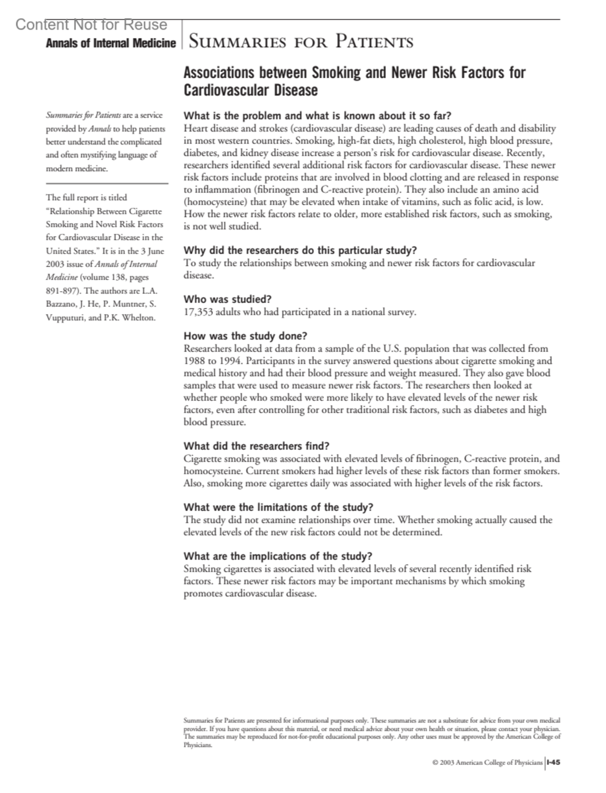 The full report is titled “Relationship Between Cigarette Smoking and Novel Risk Factors for Cardiovascular Disease in the United States.” It is in the 3 June 2003 issue of Annals of Internal Medicine (volume 138, pages 891-897). The authors are L.A. Bazzano, J. He, P. Muntner, S. Vupputuri, and P.K. Whelton.