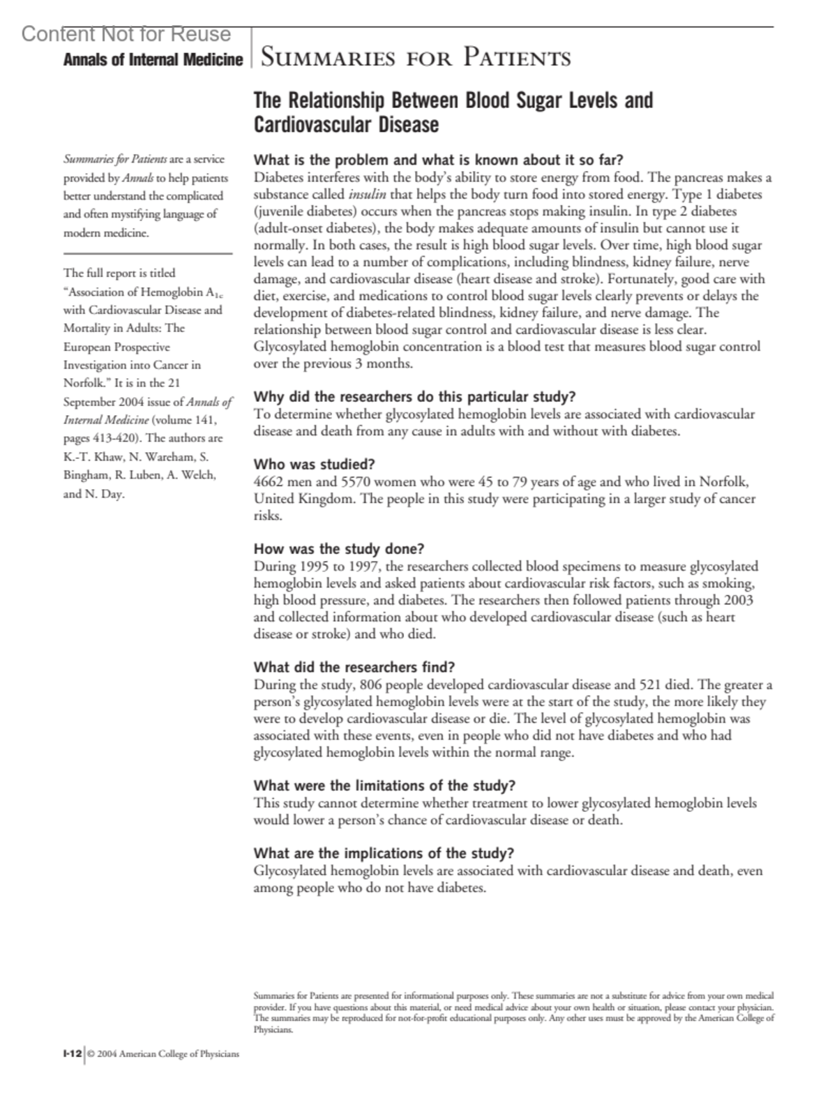The full report is titled “Association of Hemoglobin A1c with Cardiovascular Disease and Mortality in Adults: The European Prospective Investigation into Cancer in Norfolk.” It is in the 21 September 2004 issue of Annals of Internal Medicine (volume 141, pages 413-420). The authors are K.-T. Khaw, N. Wareham, S. Bingham, R. Luben, A. Welch, and N. Day.