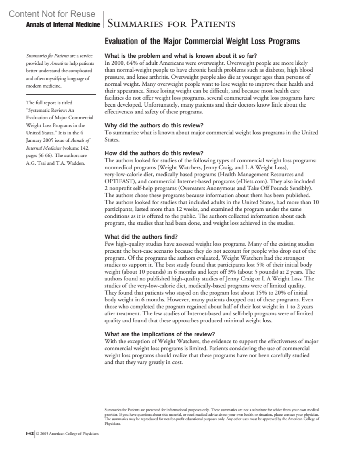The full report is titled “Systematic Review: An Evaluation of Major Commercial Weight Loss Programs in the United States.” It is in the 4 January 2005 issue of Annals of Internal Medicine (volume 142, pages 56-66). The authors are A.G. Tsai and T.A. Wadden.