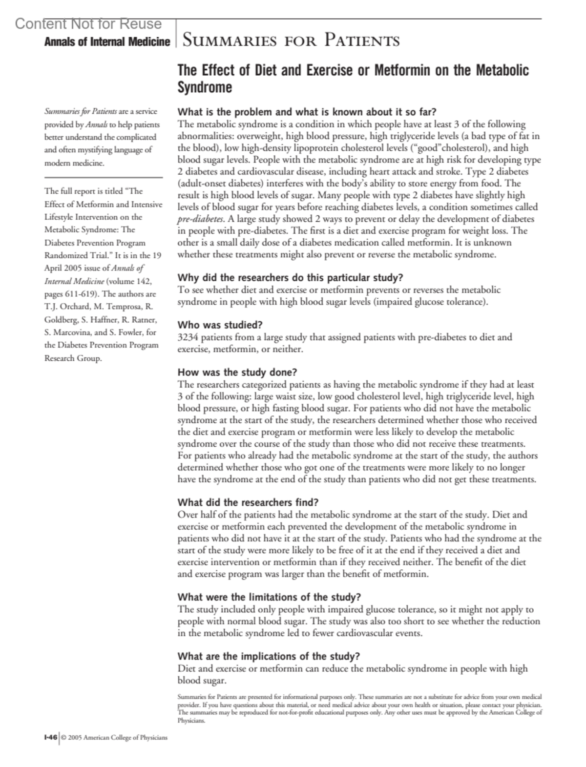 The full report is titled “The Effect of Metformin and Intensive Lifestyle Intervention on the Metabolic Syndrome: The Diabetes Prevention Program Randomized Trial.” It is in the 19 April 2005 issue of Annals of Internal Medicine (volume 142, pages 611-619). The authors are T.J. Orchard, M. Temprosa, R. Goldberg, S. Haffner, R. Ratner, S. Marcovina, and S. Fowler, for the Diabetes Prevention Program Research Group.