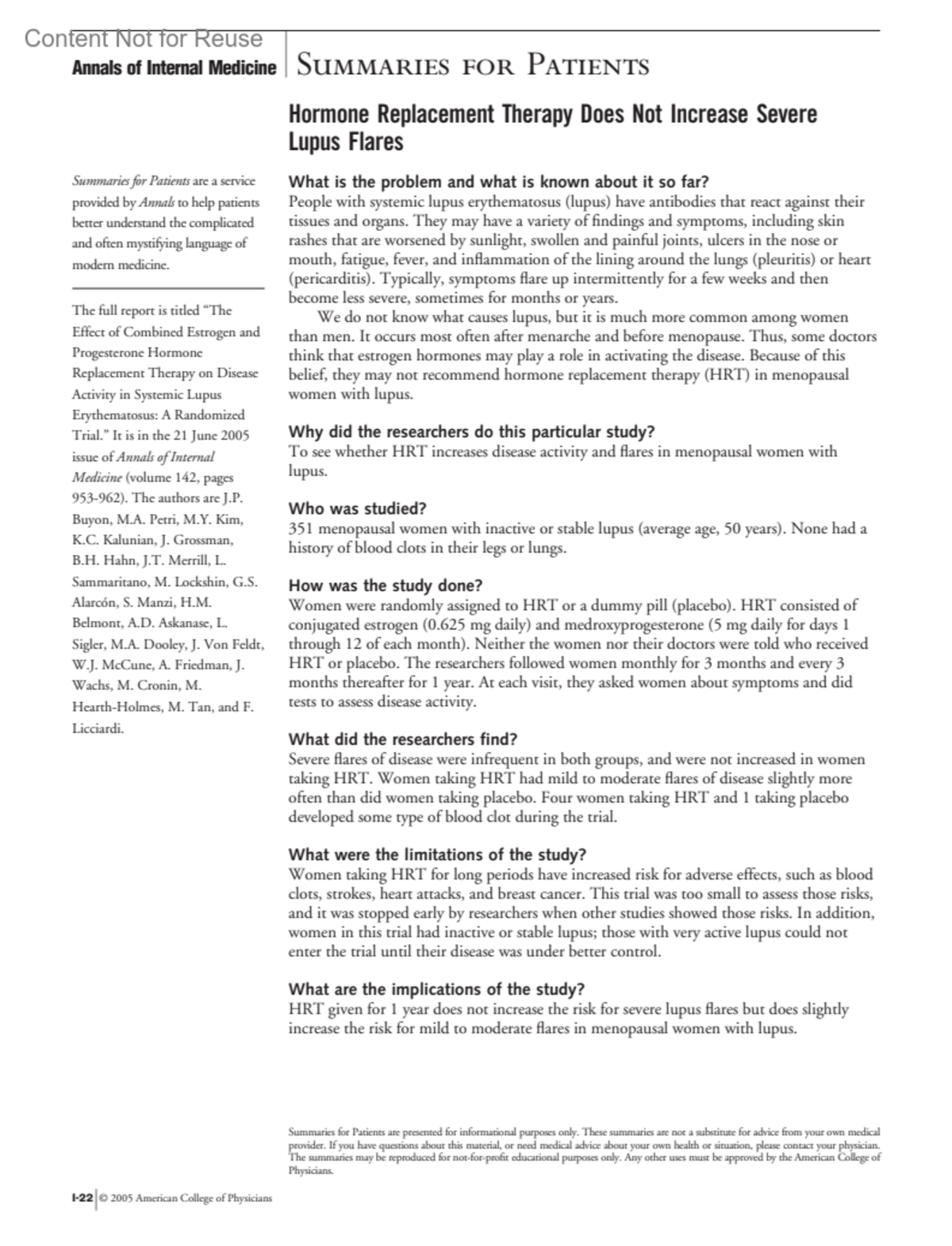 The full report is titled “The Effect of Combined Estrogen and Progesterone Hormone Replacement Therapy on Disease Activity in Systemic Lupus Erythematosus: A Randomized Trial.” It is in the 21 June 2005 issue of Annals of Internal Medicine (volume 142, pages 953-962). The authors are J.P. Buyon, M.A. Petri, M.Y. Kim, K.C. Kalunian, J. Grossman, B.H. Hahn, J.T. Merrill, L. Sammaritano, M. Lockshin, G.S. Alarcón, S. Manzi, H.M. Belmont, A.D. Askanase, L. Sigler, M.A. Dooley, J. Von Feldt, W.J. McCune, A. Friedman, J. Wachs, M. Cronin, M. Hearth-Holmes, M. Tan, and F. Licciardi.
