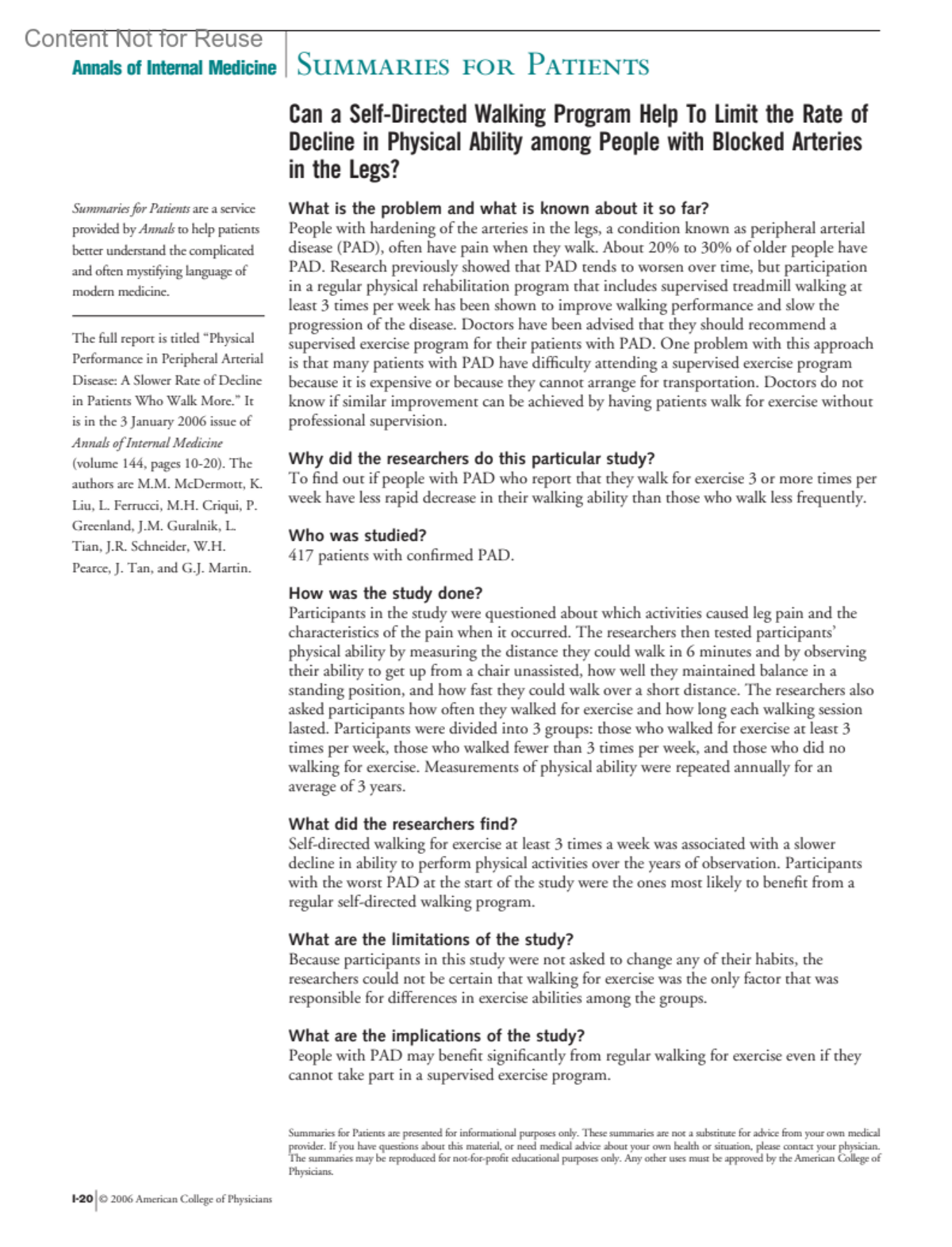The full report is titled “Physical Performance in Peripheral Arterial Disease: A Slower Rate of Decline in Patients Who Walk More.” It is in the 3 January 2006 issue of Annals of Internal Medicine (volume 144, pages 10-20). The authors are M.M. McDermott, K. Liu, L. Ferrucci, M.H. Criqui, P. Greenland, J.M. Guralnik, L. Tian, J.R. Schneider, W.H. Pearce, J. Tan, and G.J. Martin.