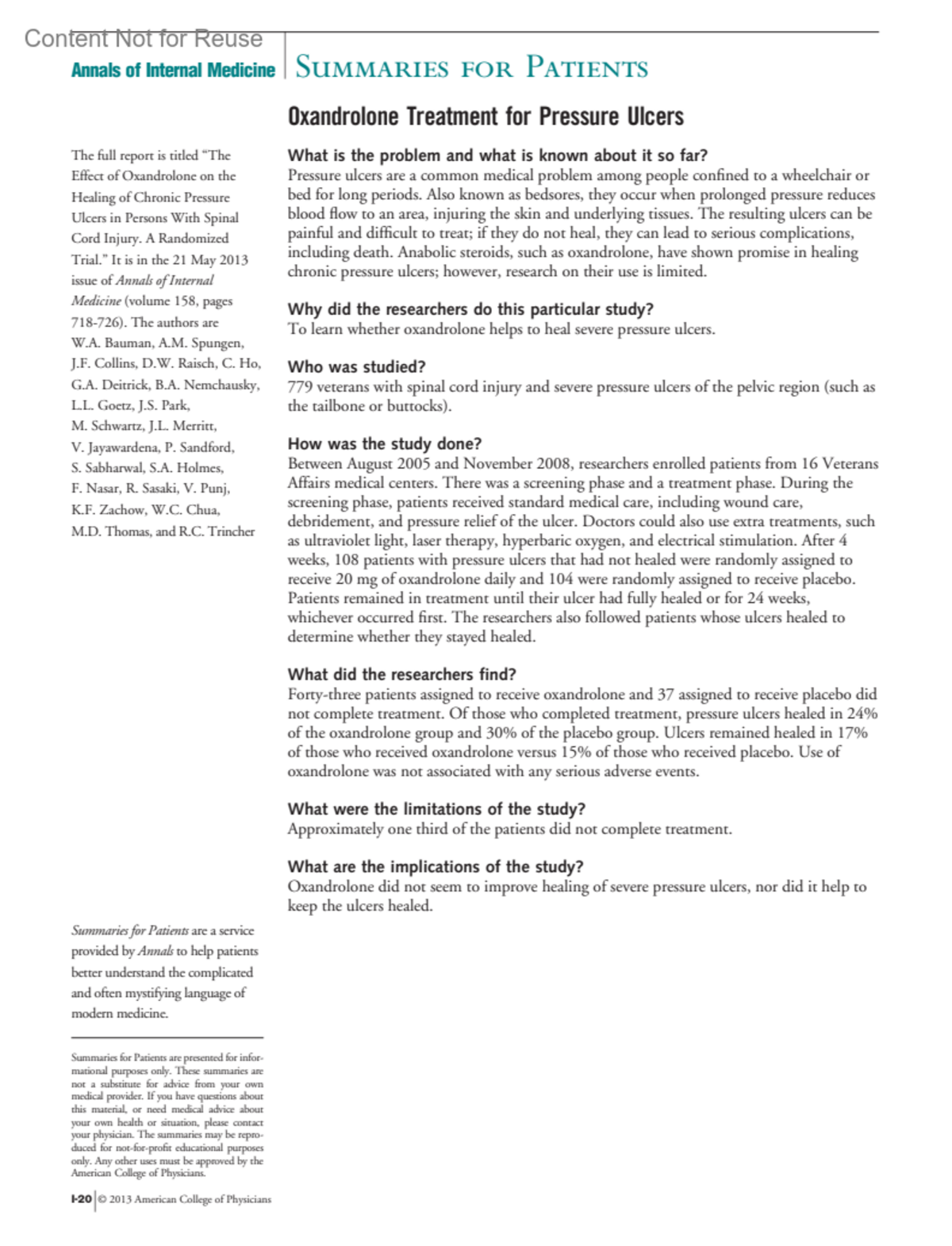 The full report is titled “The Effect of Oxandrolone on the Healing of Chronic Pressure Ulcers in Persons With Spinal Cord Injury. A Randomized Trial.” It is in the 21 May 2013 issue of Annals of Internal Medicine (volume 158, pages 718–726). The authors are W.A. Bauman, A.M. Spungen, J.F. Collins, D.W. Raisch, C. Ho, G.A. Deitrick, B.A. Nemchausky, L.L. Goetz, J.S. Park, M. Schwartz, J.L. Merritt, V. Jayawardena, P. Sandford, S. Sabharwal, S.A. Holmes, F. Nasar, R. Sasaki, V. Punj, K.F. Zachow, W.C. Chua, M.D. Thomas, and R.C. Trincher