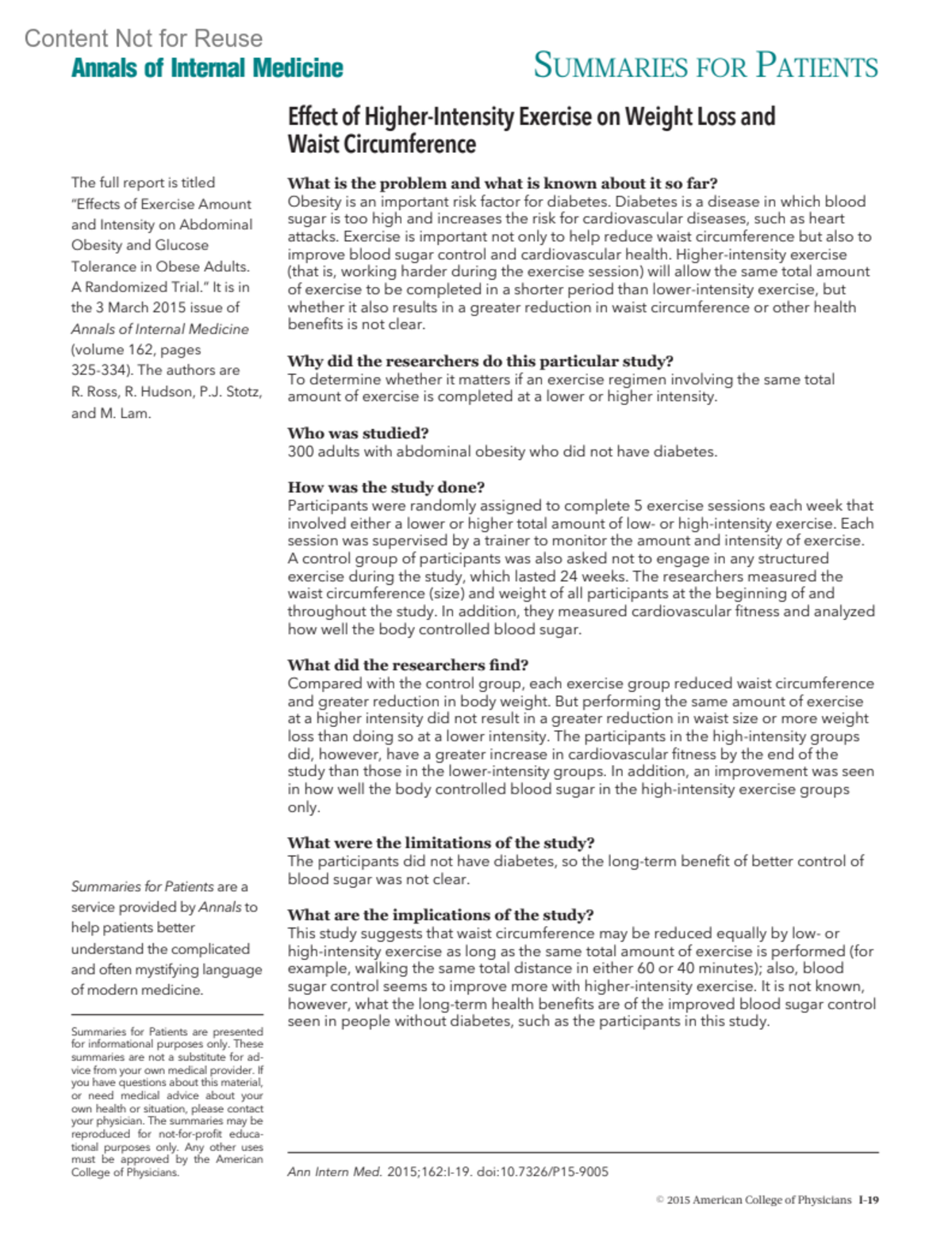 The full report is titled “Effects of Exercise Amount and Intensity on Abdominal Obesity and Glucose Tolerance in Obese Adults. A Randomized Trial.” It is in the 3 March 2015 issue of Annals of Internal Medicine (volume 162, pages 325–334). The authors are R. Ross, R. Hudson, P.J. Stotz, and M. Lam.