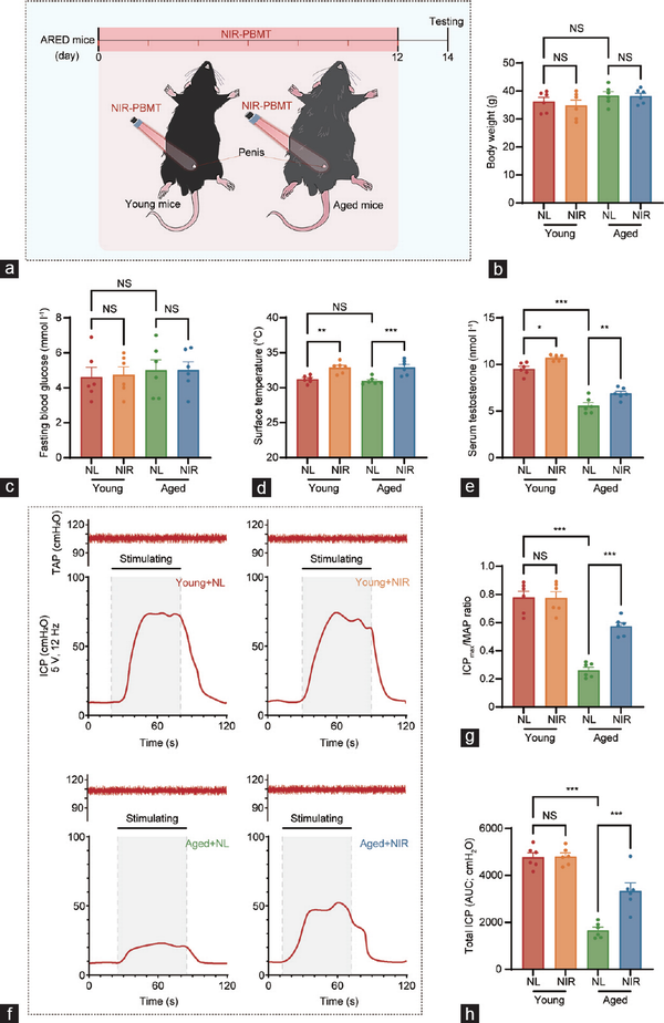 Schematic diagram of NIR-PBMT and erectile function analyses of the ARED animal model. (a) The penises of naturally aged mice (20 months old) were irradiated with a NIR at 808 nm and 4 J cm−2 for 2 weeks, with treatment every 48 h. A comparison of the general conditions between young mice (3 months) and aged mice (20 months) treated with natural light and NIR (mean±s.e.m.; n=6 per group). (b) Body weight, (c) fasting blood glucose, (d) surface temperature at the treatment site, and (e) serum testosterone levels were measured for each group of mice. (f) Measurement of erectile function via electrical stimulation of the cavernous nerve. Representative ICP tracings were obtained following cavernous nerve stimulation at 12 Hz and 5 V for 60 s, respectively, in the young with NL, young with NIR, aged with NL, and aged with NIR. The orange line segment represents the duration of electrical stimulation (60 s). (g) Mean ICPmax was calculated for each group. (h) Total ICP (ICP AUC) was calculated for each group. Data are expressed as the mean±s.e.m. of 6 mice. Statistical analysis was performed using an unpaired t-test. *P<0.05, **P<0.01, and ***P<0.001. NS: not significant; NIR-PBMT: near-infrared photobiomodulation therapy; ARED: age-related erectile dysfunction; ICP: intracavernous pressure; ICPmax: maximum ICP; MAP: mean arterial pressure; NL: natural light; AUC: area under the curve; s.e.m.: standard error of the mean; TAP: tail arterial pressure.
