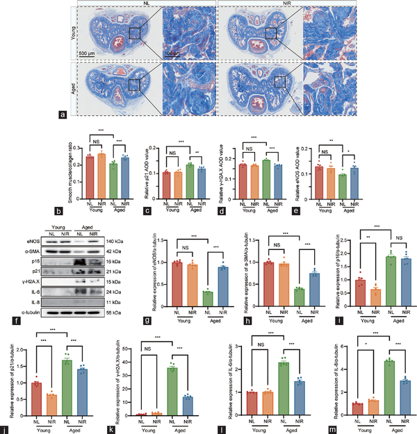 Histological analysis of corpus cavernosum tissue fibrosis and comprehensive analysis of erectile and senescence markers contents in different groups. (a) Penis samples in the young with NL, young with NIR, aged with NL, and aged with NIR were prepared for the detection of corpus cavernosum tissue fibrosis using Masson’s trichrome staining. Semi-quantitative image analysis of (b) smooth muscle/collagen ratio, (c) p21 expression, (d) γ-H2A.X expression, and (e) eNOS expression in corpus cavernosum tissues. (f) Representative western blotting images depicting the protein bands of interest. Quantitative assessment of relative protein expression levels for (g) eNOS, (h) α-SMA, (i) cell cycle inhibitor p16, (j) cell cycle inhibitor p21, (k) γ-H2A.X, (l) IL-6, and (m) IL-8. Data are expressed as the mean±standard error of the mean of 6 mice. Statistical analysis was performed using an unpaired t-test. *P<0.05, **P<0.01, and ***P<0.001. NS: not significant; NL: natural light; NIR: near-infrared; γ-H2A.X: phosphorylated H2A histone family member X; eNOS: endothelial nitric oxide synthase; α-SMA: alpha-smooth muscle actin; IL-6: interleukin-6; IL-8: interleukin-8; AOD: average optical density.