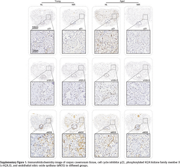 The immunohistochemical examination has yielded profound insights into the age-associated alterations within the penile corpora cavernosum, with a particular focus on the expression of cellular senescence markers. A marked diminution in the immunopositive areas for two senescence-associated proteins (p21 and γ-H2A.X) was observed in aged mice compared to young mice (Figure 2c and 2d). Following NIR laser therapy, a robust decrease in the contents of p21 and γ-H2A.X was observed within the cavernosum tissue of aged mice (Figure 2c and 2d, and Supplementary Figure 1). The IHC staining revealed a significant reduction in the positive areas for eNOS within the penile corpora cavernosum of aged mice compared to young mice. Following NIR laser therapy, a pronounced increase in the protein contents of eNOS was observed in the cavernosum tissue of aged mice (Figure 2e and Supplementary Figure 1).