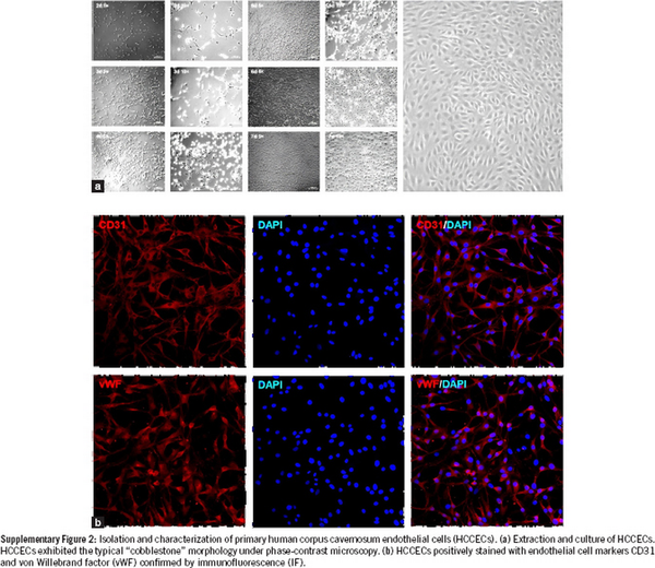 Isolation and characterization of primary human corpus cavernosum endothelial cells (HCCECs). (a) Extraction and culture of HCCECs. HCCECs exhibited the typical “cobblestone” morphology under phase-contrast microscopy. (b) HCCECs positively stained with endothelial cell markers CD31 and von Willebrand factor (vWF) confirmed by immunofluorescence (IF).