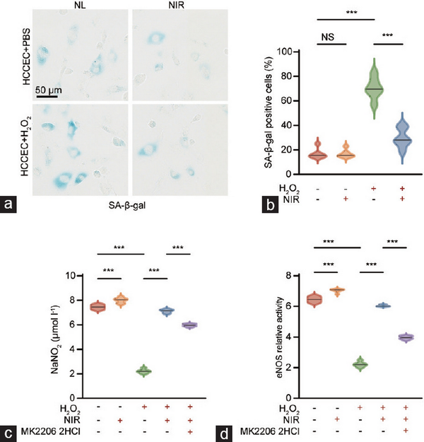 In vitro assessment of cellular senescence and injury repair in primary HCCECs. (a) Representative images of β-galactosidase staining in HCCECs. (b) Quantification of SA-β-gal-positive cells. (c) NIR therapy promotes NO release and (d) eNOS activity in aged HCCECs, whereas this effect is partially abrogated by the Akt inhibitor MK-2206 2HCl. Data are expressed as the mean±standard error of the mean. Statistical analysis was performed using an unpaired t-test. ***P<0.001. NS: not significant; HCCEC: human corpus cavernosum endothelial cell; NIR: near-infrared; NO: nitric oxide; eNOS: endothelial nitric oxide synthase; Akt: protein kinase B.