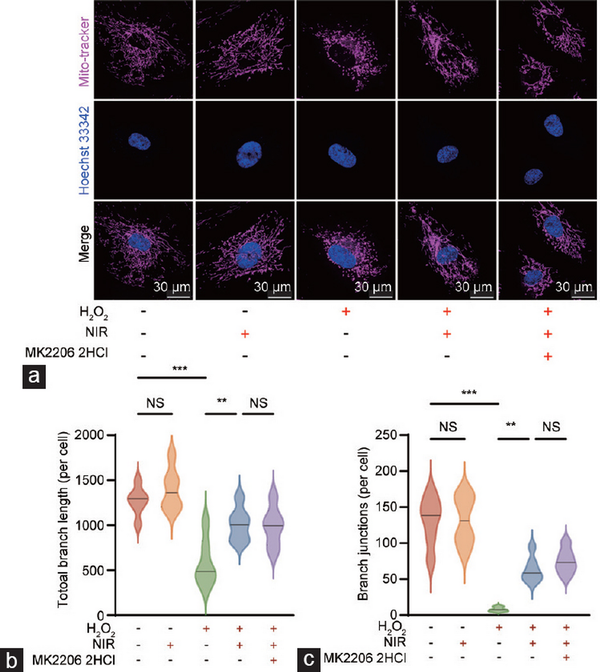 Subsequently, we employed the mitochondrial probe Mito-tracker 633 to evaluate the morphology and function (focusing on the network structure) of mitochondria in live HCCECs. We observed a significant decrease in the total branch length and branch junctions of the mitochondrial network in aged HCCECs, which was substantially restored by NIR-PBMT. Notably, inhibition of the PI3K/Akt pathway by MK-2206 2HCl did not affect the mitochondrial functional recovery induced by NIR (Figure 5a–5c).