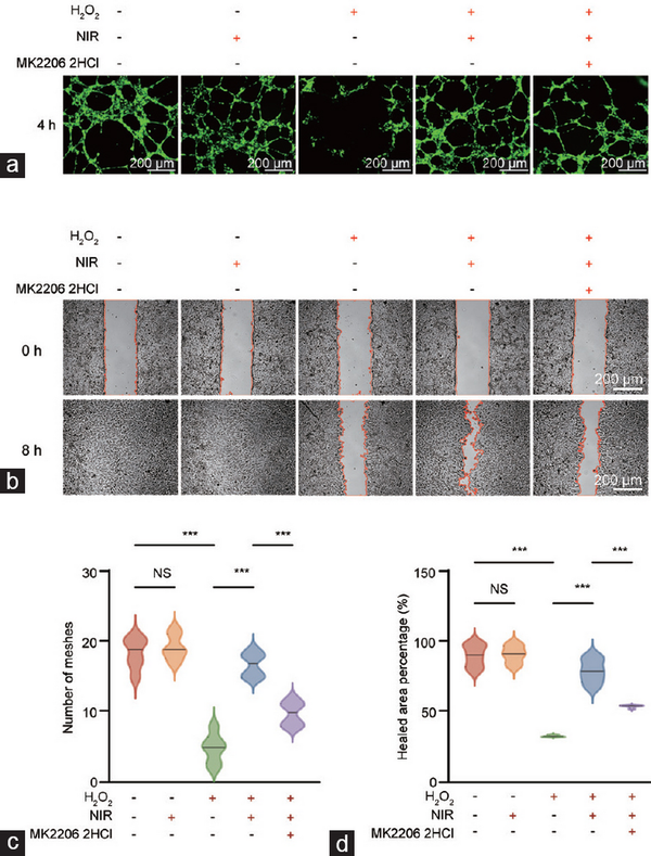 Furthermore, we observed whether NIR-PBMT could affect the tube-forming capacity and migratory ability of endothelial cells. Angiogenesis assays revealed a marked reduction in the tube-forming ability of senescent HCCECs (Figure 6a), and wound healing assays indicated a substantial decline in their migratory capacity (Figure 6b). Interestingly, NIR-PBMT notably rejuvenated the tube-forming capacity and migratory ability of aged HCCECs. Notably, the blockade of the PI3K/Akt signaling pathway significantly counteracted the pro-angiogenic and pro-migratory effects of NIR-PBMT (Figure 6c and 6d).