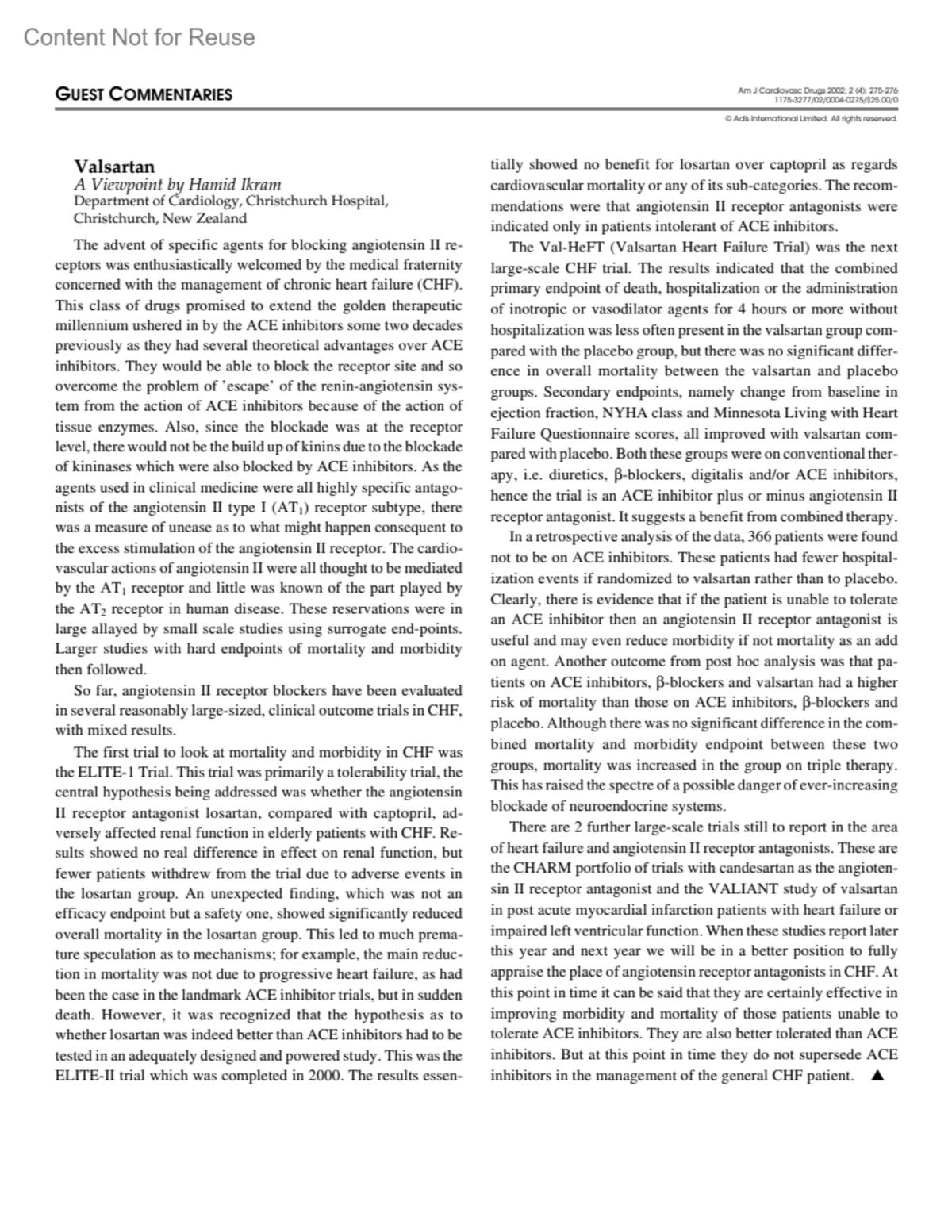ValsartanA Viewpoint by Hamid IkramIkram, HamidAuthor informationDepartment of Cardiology, Christchurch Hospital, Christchurch, New ZealandAmerican Journal of Cardiovascular Drugs 2(4):p 275-276, 2002.Copyright © 2002 Adis International