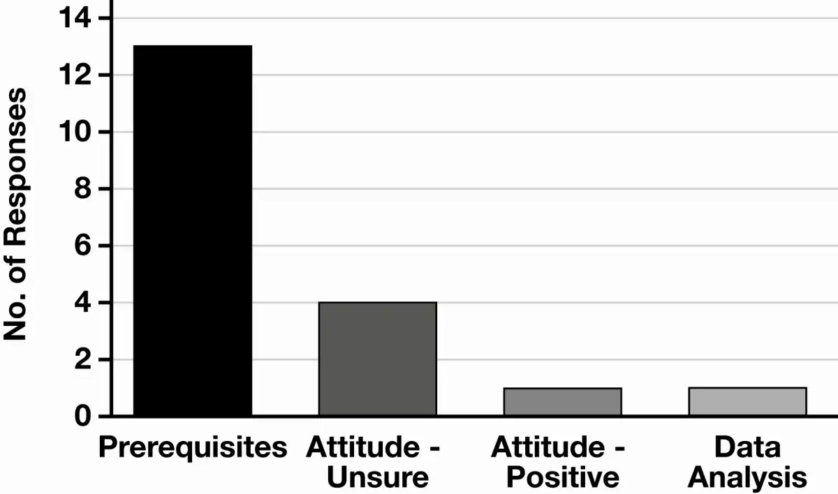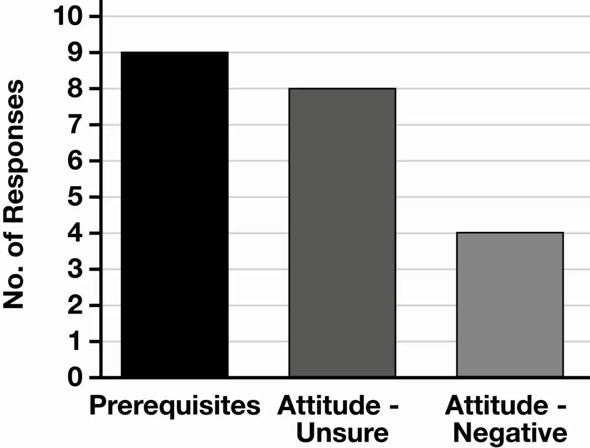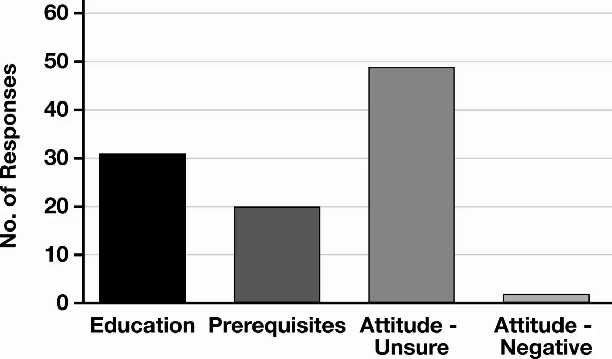 Participants were asked what they would need to feel comfortable with using AI in the diagnostics space. Most respondents had an “unsure attitude” toward what they needed most to adopt AI in their practice. For example, respondent 69 said, “this seems like too forward thinking of a question that we aren’t yet prepared to answer.” Others felt like they need education (eg, specific to tools and on AI in general). Respondent 40 answered “specific training to device” and respondent 46 said “AI short course training.” Most of the remaining group felt like they needed various prerequisites (eg, support systems, certifications, and evidence of benefits) to feel comfortable to adopt AI in their practice. There were missing data for 23 of the participants; see Figure 4 for the counts per theme.