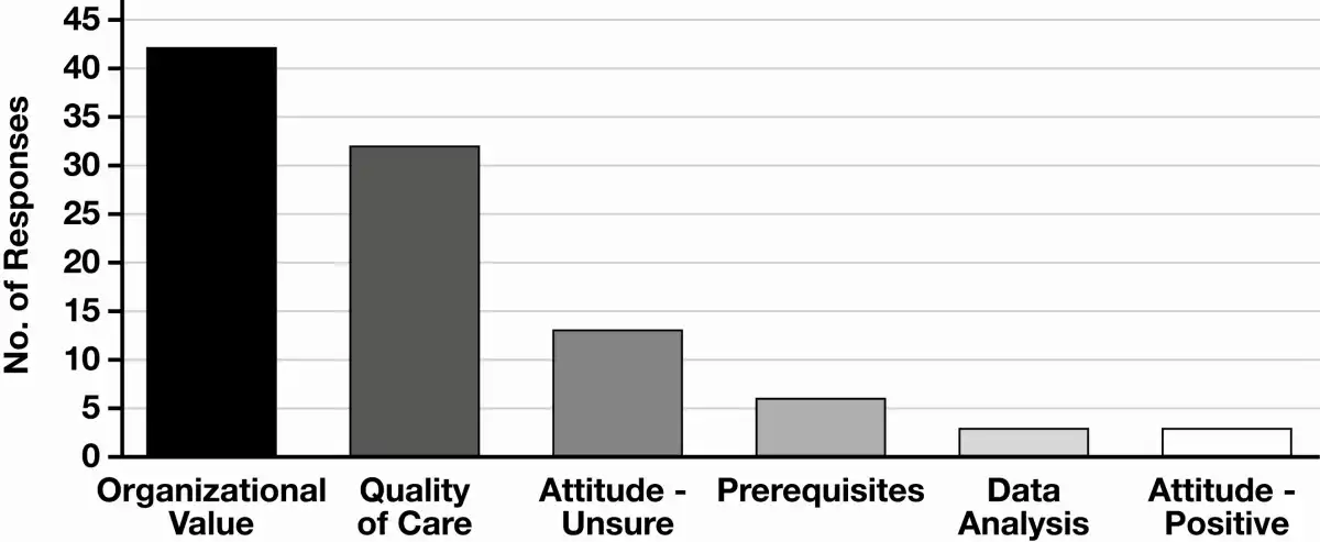 The 19% (95% CI, 12.1%-27.5%) of respondents who did not consider AI to be valuable in their organizations in the next 5 years had more uniform responses. The answers were largely split between the themes’ “prerequisites” (eg, budget and strategic plan) and an unsure attitude. See Figure 3 for more details. The missing prerequisites, for example, were presented by respondent 47: “very expensive and we have very limited capital dollars that we need to use to refresh old technology,” and respondent 106 said, “it’s not in our strategic plan to implement AI at this time.” The unsure attitude toward AI was summed up by respondent 75: “I’m not sure about the use of AI.”