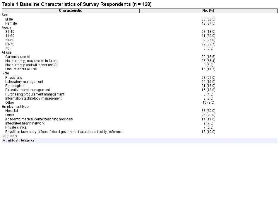 With a web-based survey among stakeholders in laboratory medicine in the United States, we aimed to evaluate their current perspectives on the value of AI in the diagnostics space and identify anticipated challenges with the introduction of AI in this field, as well as resistance to introduction of this new technology in today’s practice.