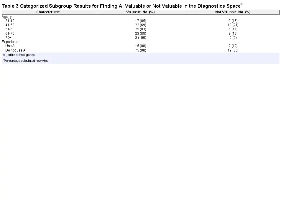 The participants did not represent the entire population of practitioners who will be using AI in a diagnostic setting. We cannot generalize these findings to all laboratory medicine practitioners across multiple types of settings. Finally, the study population (n = 128) was relatively small for quantitative analyses, perhaps causing the nonsignificance of the χ 2 tests. Only a large difference in how AI was valued between groups would have shown significant results in the quantitative analysis.