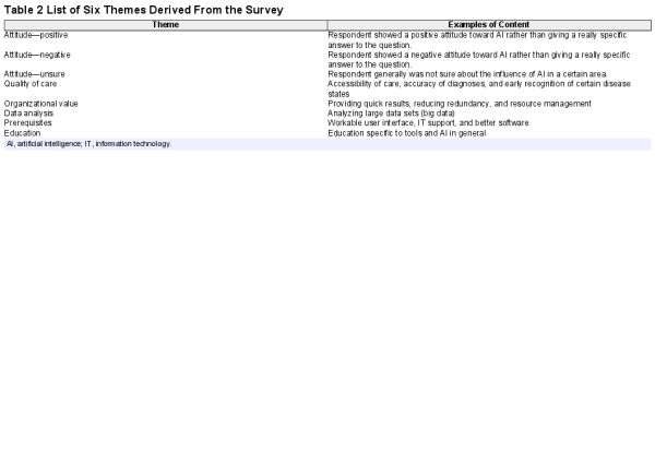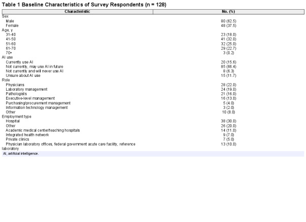 The participants did not represent the entire population of practitioners who will be using AI in a diagnostic setting. We cannot generalize these findings to all laboratory medicine practitioners across multiple types of settings. Finally, the study population (n = 128) was relatively small for quantitative analyses, perhaps causing the nonsignificance of the χ 2 tests. Only a large difference in how AI was valued between groups would have shown significant results in the quantitative analysis.