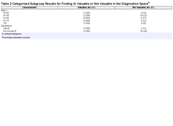 Regarding the potential use of AI in the diagnostics space, of the 90 (81%; 95% CI, 72.6%-87.9%) participants who felt AI will be valuable in their organization within the next 5 years, 20 (18%; 95% CI, 11.4%-26.5%) labeled it as expected to be extremely valuable. Twenty-one (19%; 95% CI, 12.1%-27.5%) of the respondents felt like AI will not be valuable in their organization within the next 5 years. There were missing data on this question for 17 participants. To further examine whether the results were different in subgroups of respondents, we dichotomized the answers to finding AI valuable (including extremely valuable, very valuable, and somewhat valuable; n = 90) or not valuable at all (n = 21). A χ 2 test showed no significant difference in how participants in the different age groups valued AI in the diagnostics space (χ 2 = 5.0947 [4 degrees of freedom]; P = .28). Also, there was no significant difference in how AI was valued between respondents who currently use AI in their practice (n = 17) compared with respondents who have not used it yet (χ 2 = 0.6698 [1 degree of freedom]; P = .41). Table 3 shows the number of respondents to find AI valuable or not valuable in the different subgroups.